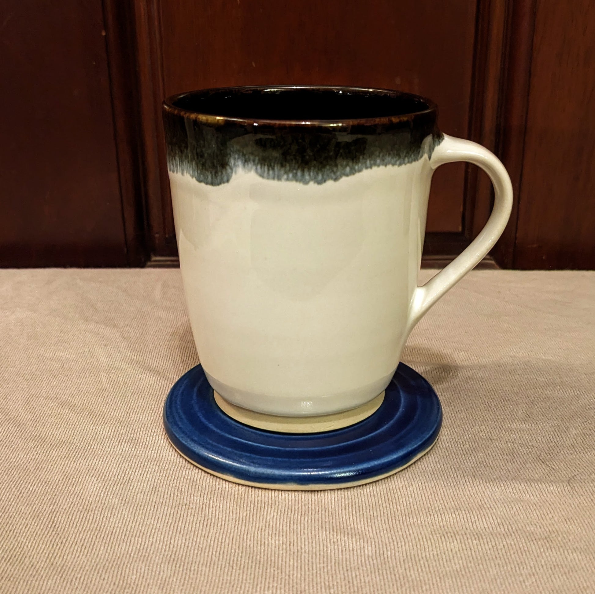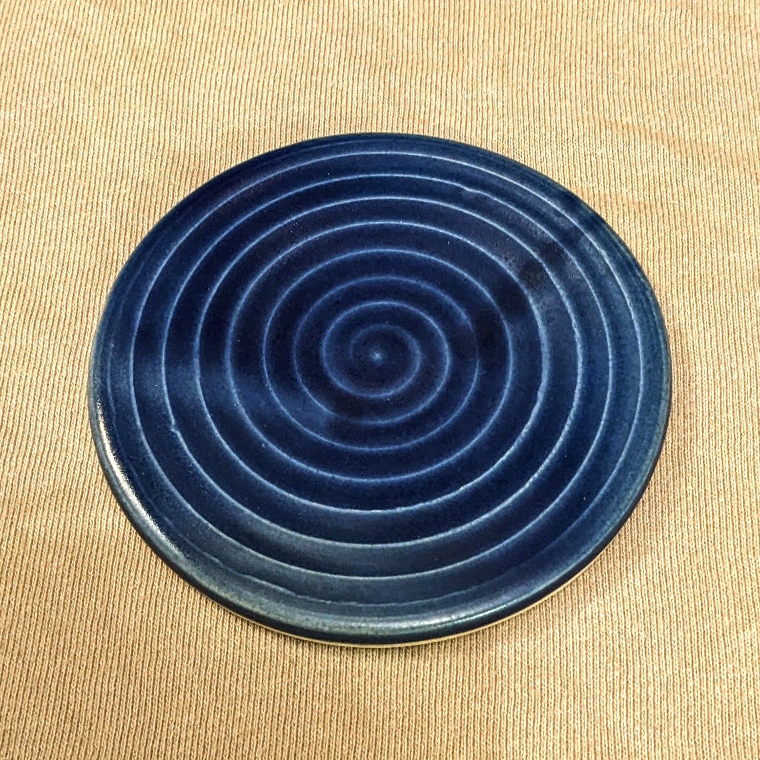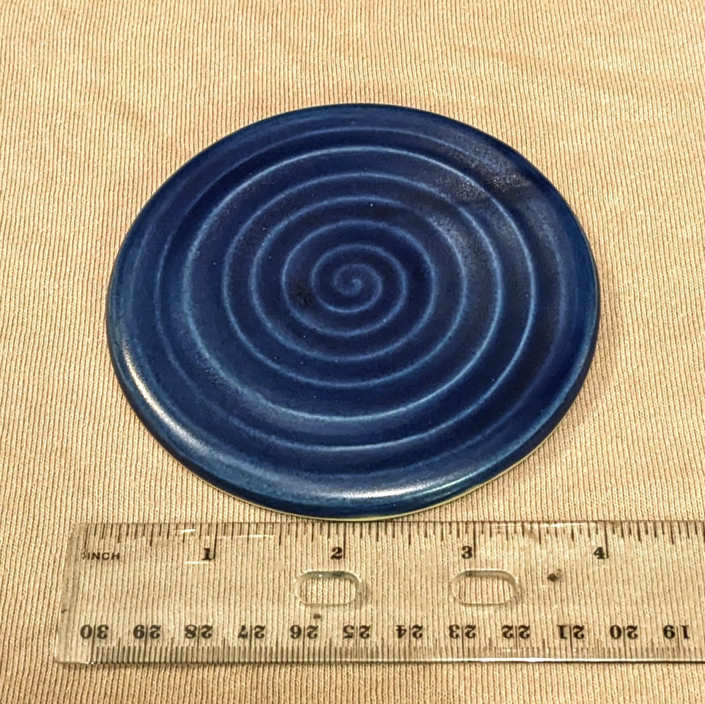 This coaster was made this autumn at my community studio. It was made with the glaze, The Blue, which is provided at my studio, and has a smooth, glassy feel to it. This piece is dishwasher and microwaveable safe.