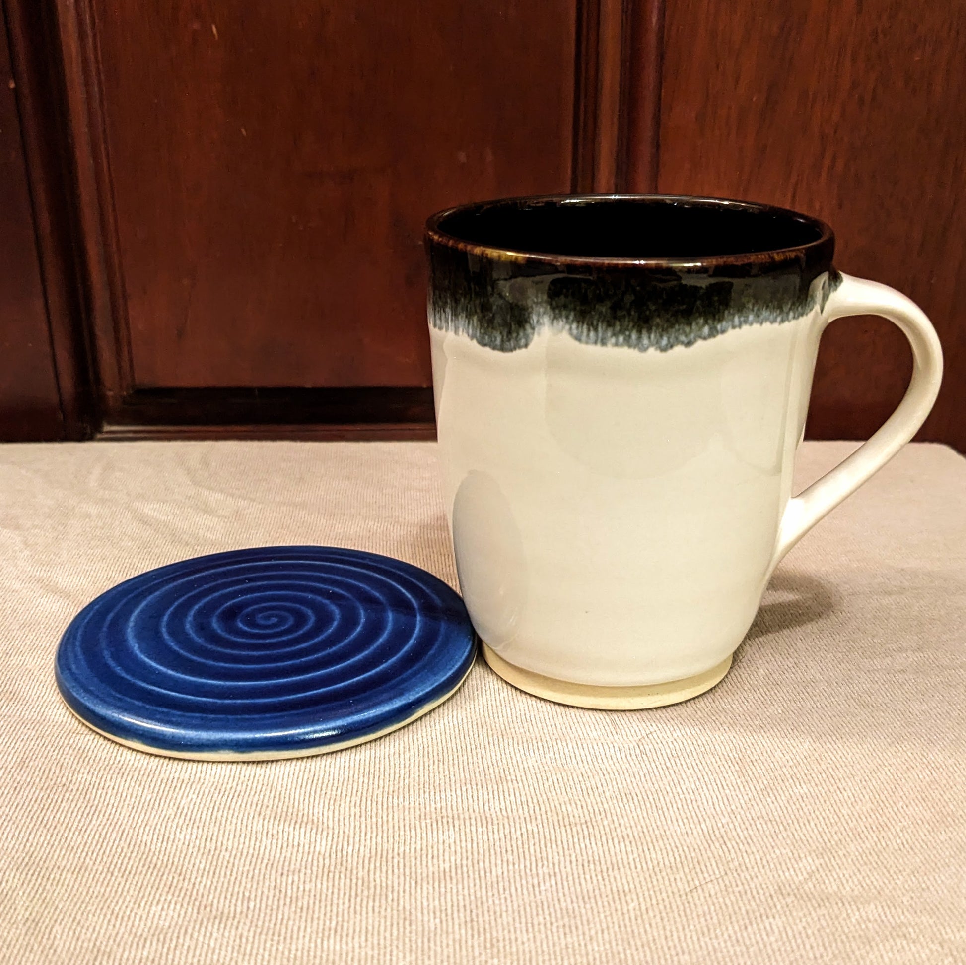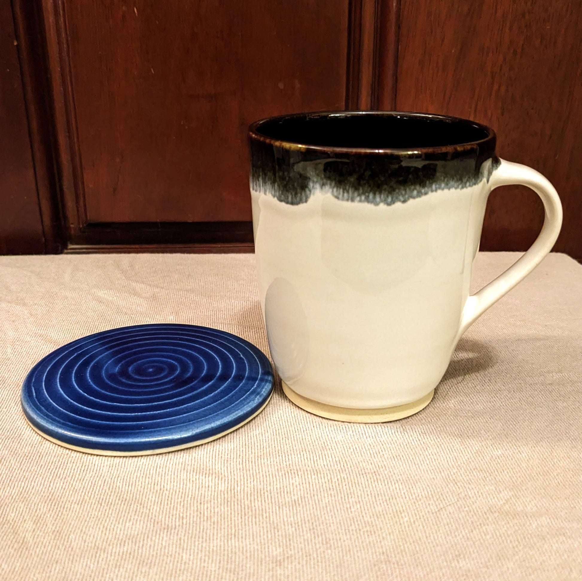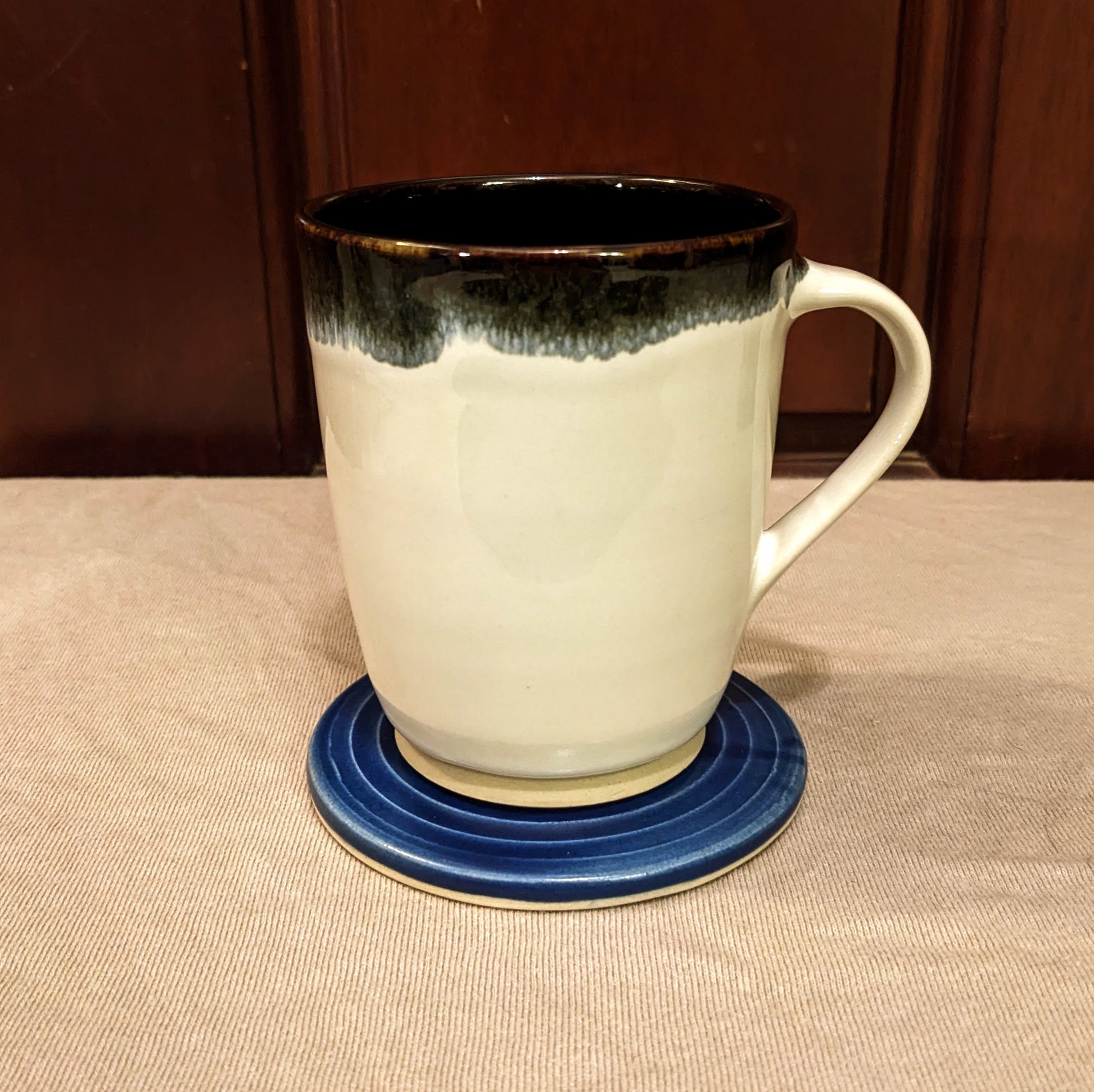 This coaster was made this autumn at my community studio. It was made with the glaze, The Blue, which is provided at my studio, and has a smooth, glassy feel to it. This piece is dishwasher and microwaveable safe.