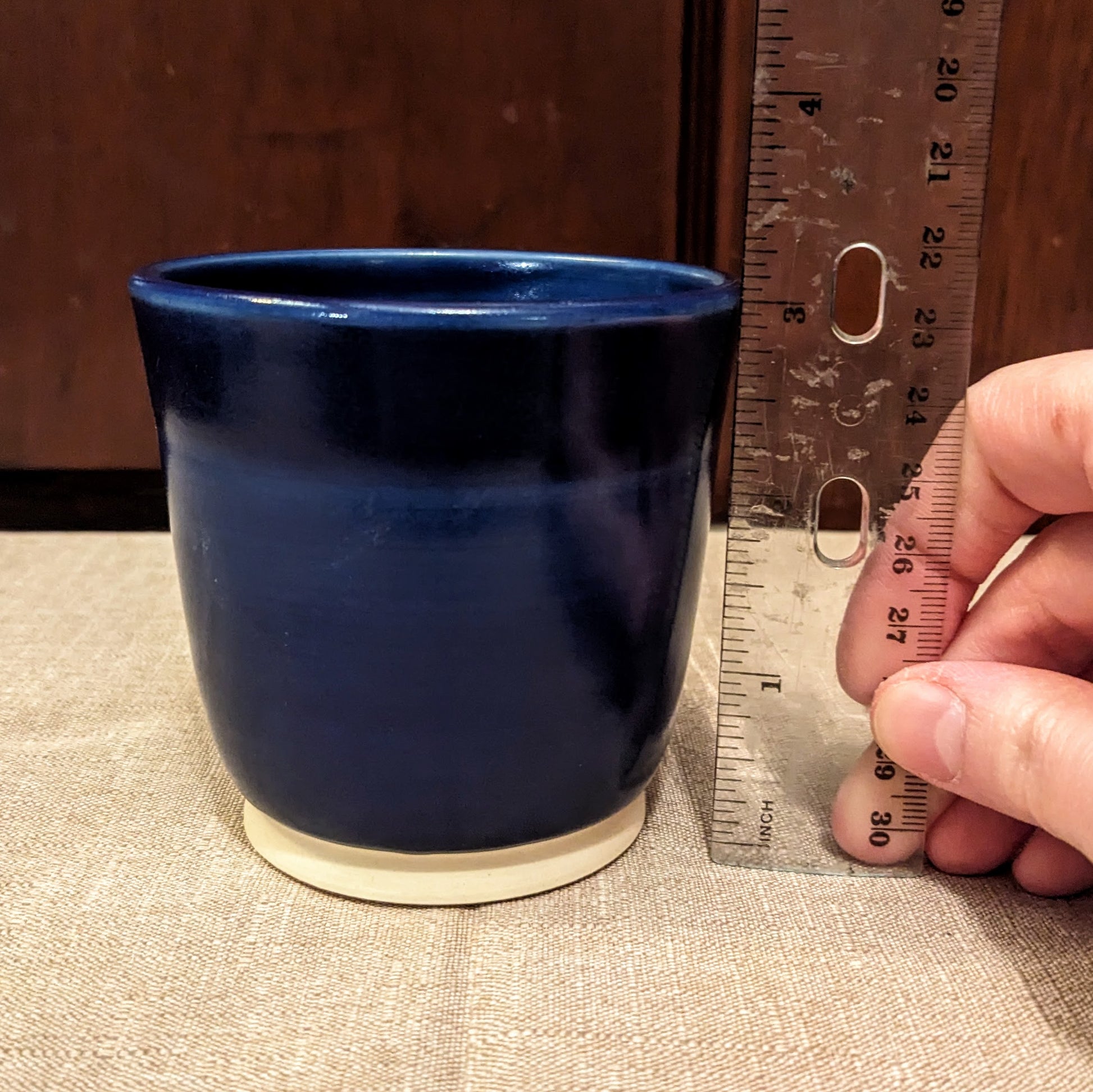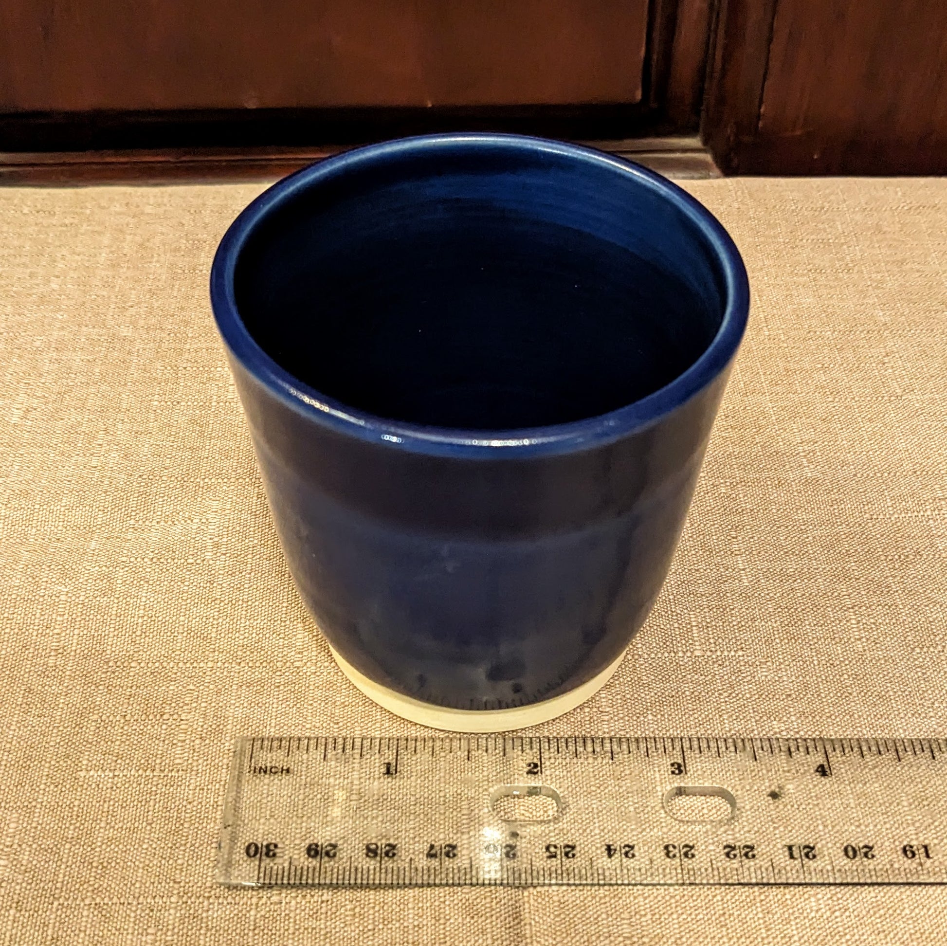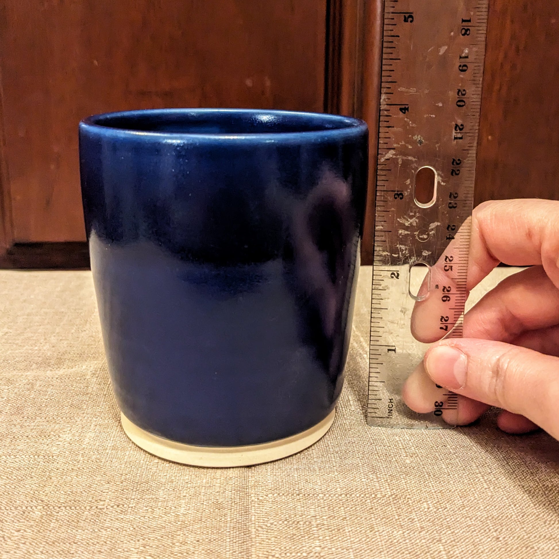 This cup was made this autumn at my community studio. It was made with the glaze The Blue, which are provided at my studio, and has a smooth, glassy feel to it. This piece is dishwasher and microwaveable safe.