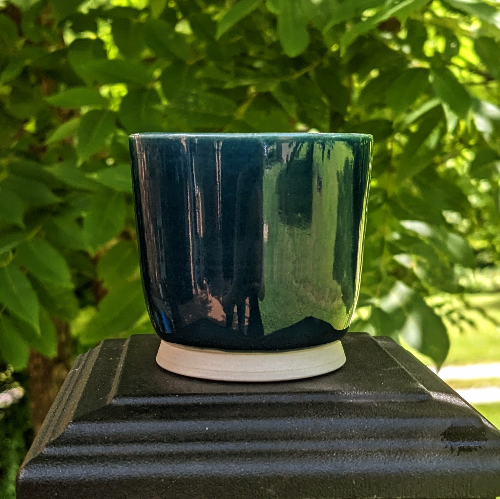This espresso cup was made this spring at my community studio. It was made with the glaze, Dark Teal, which is provided at my studio, and has a smooth, glassy feel to it. This piece is dishwasher and microwaveable safe.