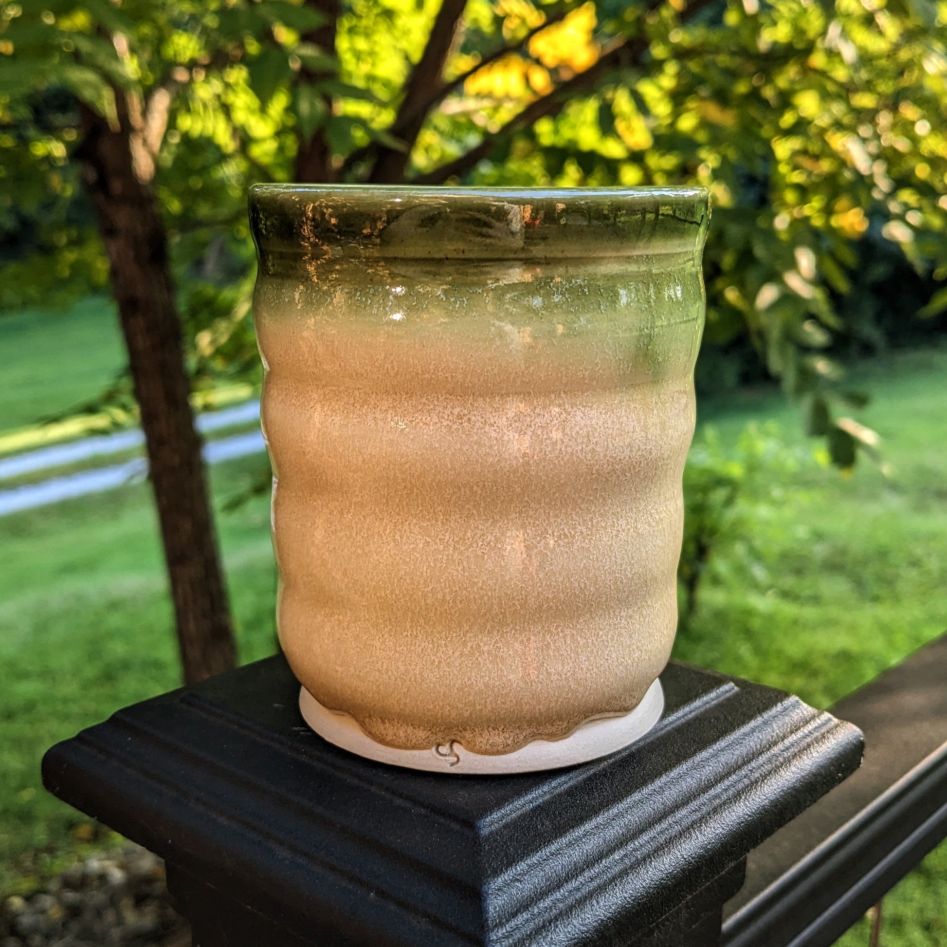 This cup was made this summer at my community studio and was inspired by a similar looking cup in Animal Crossing New Horizons. It was made with the glazes, Jurassic Park Green and Bone, which are provided at my studio, and has a smooth, satiny feel to it. This piece is dishwasher and microwaveable safe.