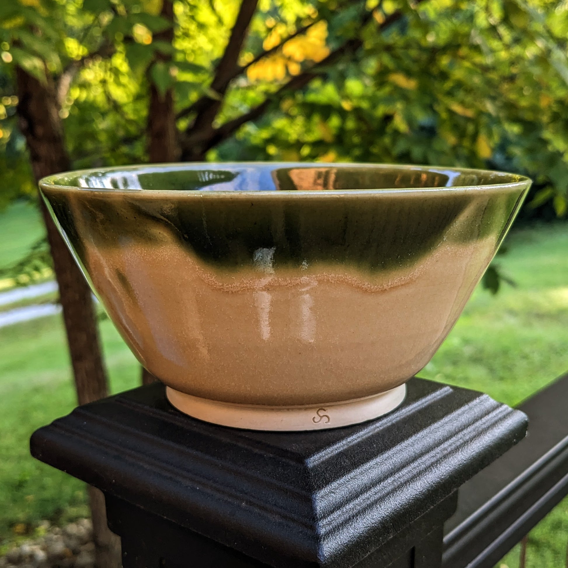 This medium bowl was made this summer at my community studio. It was made with the glazes, Jurassic Park Green and Bone, which are provided at my studio, and has a smooth, glassy feel to it. This piece is dishwasher and microwaveable safe.