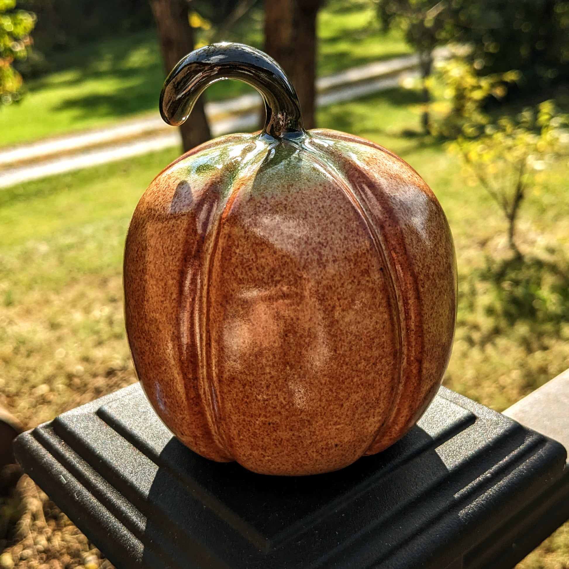 This pumpkin was made this autumn at my community studio. It was made with the glazes Nutmeg and Jurassic Park Green, which are provided at my studio, and has a smooth, glassy feel to it. This piece is dishwasher and microwaveable safe.