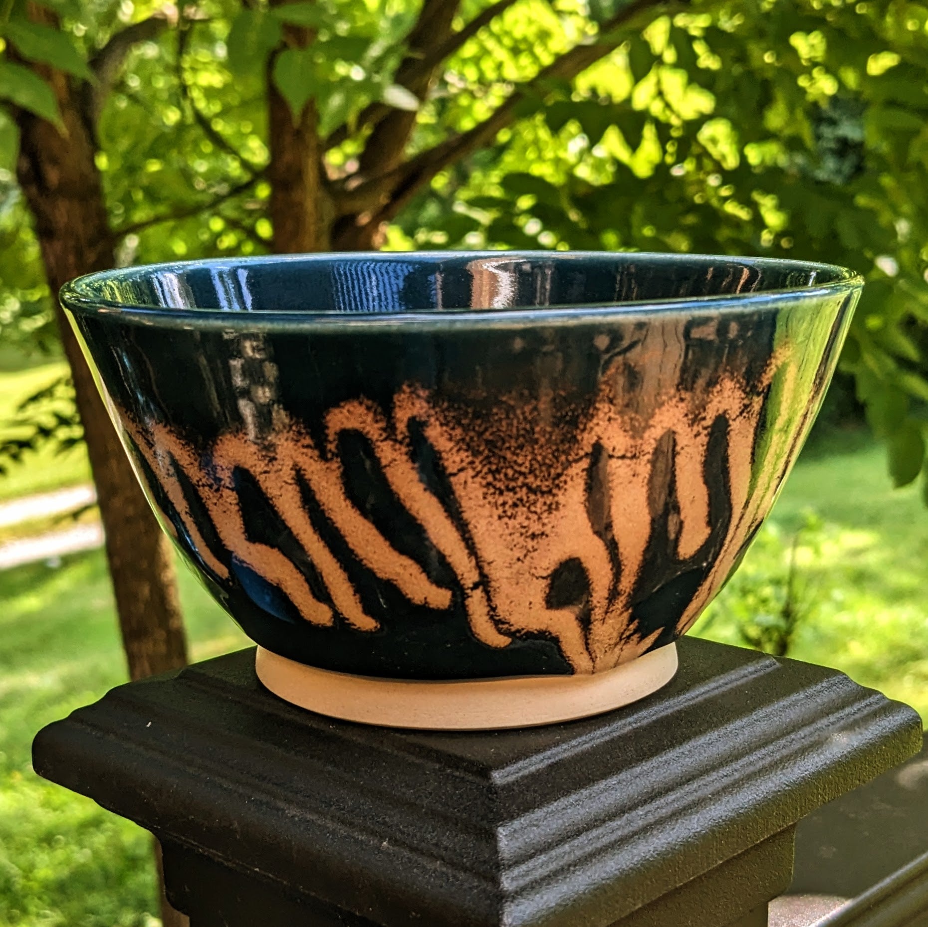 This medium bowl was made this spring at my community studio. It was made with the glazes Dark Teal and Ocean Blue, which are provided at my studio, and has a smooth, satiny feel to it. This piece is dishwasher and microwaveable safe.