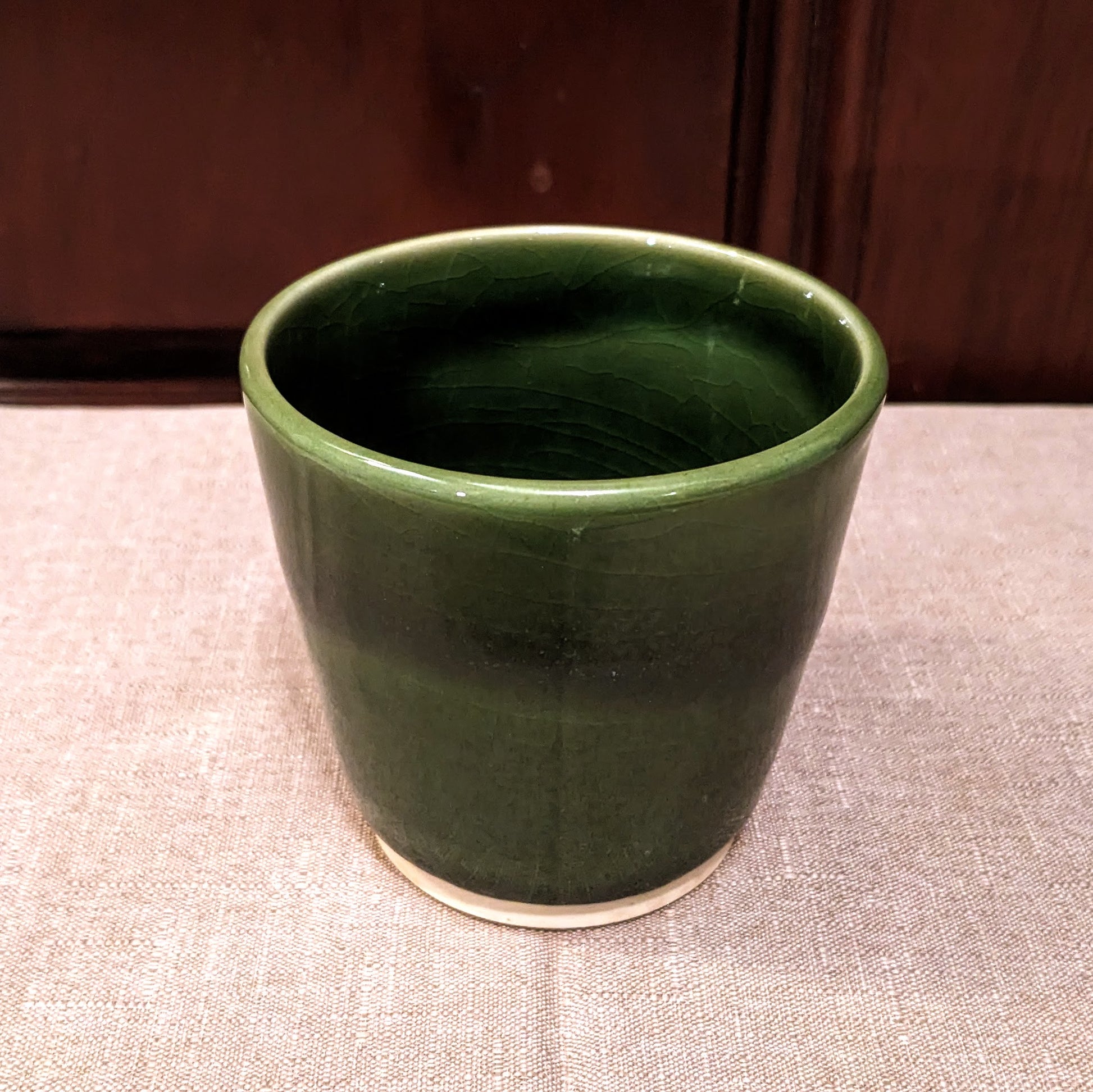 This cup was made this autumn at my community studio. It was made with the glaze Jurassic Park Green, which are provided at my studio, and has a smooth, glassy feel to it. This piece is dishwasher and microwaveable safe.