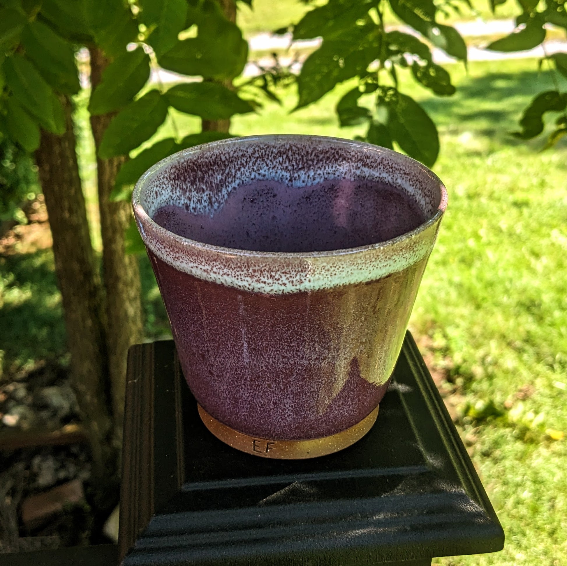 This small planter was made this spring at my community studio. It was made with the glazes, Purple Gloss and Shiny White, which are provided at my studio, and has a smooth, satiny feel to it. This piece is dishwasher and microwaveable safe.