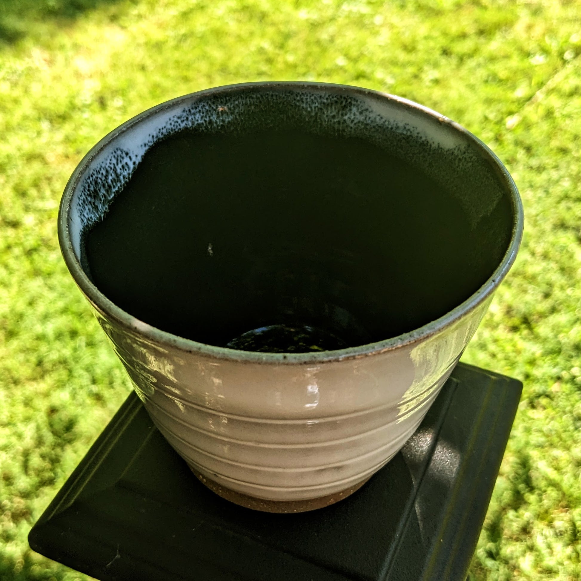 This small planter was made this spring at my community studio. It was made with the glazes, Dark Teal and Shiny White, which are provided at my studio, and has a smooth, glassy feel to it. This piece is dishwasher and microwaveable safe.